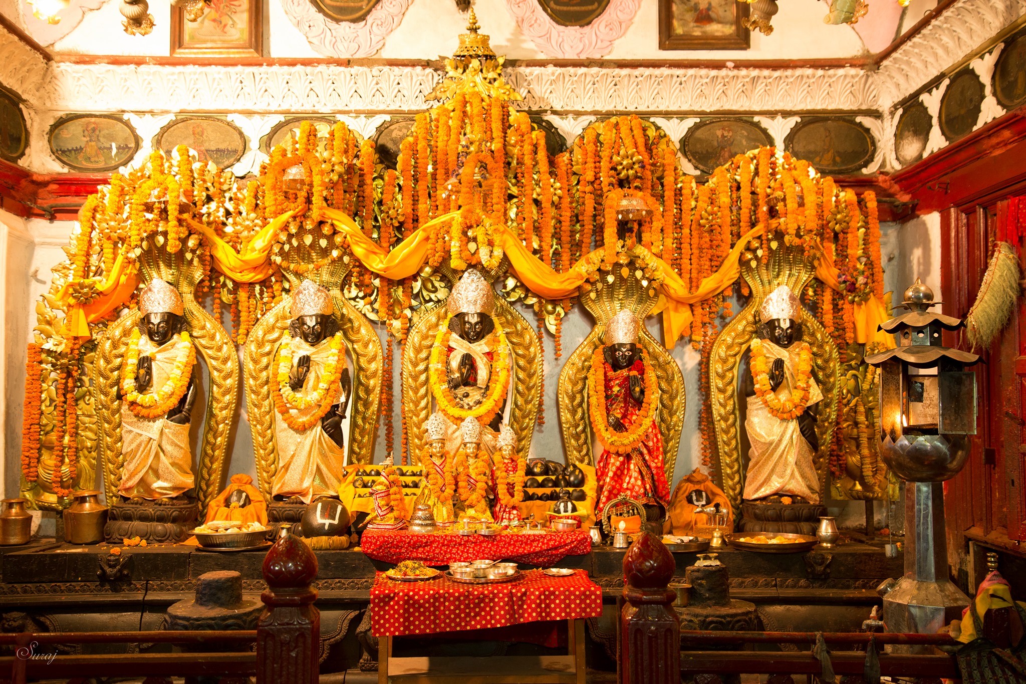 The Śrī Rāmachandra Temple is unlike any other. Its sanctum houses a rare and awe-inspiring ensemble of idols crafted from sacred śāligrāma śilā (black stones): Śrī Rāma, radiating dignity; Sītā, a beacon of compassion and strength; Lakṣmaṇa, symbolizing devotion; Bharata, embodying discipline; and Śatrughna, representing vigilance. Nearby, a majestic idol of Hanumān, the supreme devotee, stands with folded hands, inspiring unwavering faith. These idols are not mere sculptures but living symbols of values that guide human life—peace, prosperity, and harmony. They invite visitors to reflect on the timeless teachings of the Rāmāyaṇa, where Śrī Rāma’s life exemplifies duty, truth, and compassion.